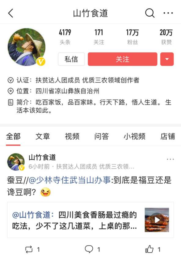 在祖国的西南边陲,有这样一个地方“群峰嵯峨,四时多寒”,因而得名凉山。四川省凉山彝族自治州是全国最大的彝族聚居区。今日头条和西瓜视频平台上,有位名为“山竹食道”的创作者,是地道的凉山彝族人。通过分享自己的日常生活,他吸引了17万粉丝的关注。