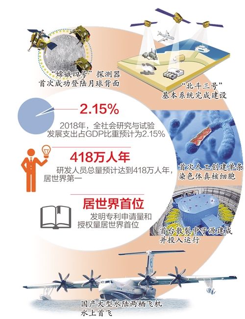 据介绍,2018年,我国基础前沿和战略高技术领域重大创新成果竞相涌现:首次在半导体量子点体系中实现三量子比特逻辑门、首次发现铁基超导体中的马约拉纳束缚态、首次人工创建单条染色体真核细胞、首台散裂中子源建成并投入运行、“嫦娥四号”探测器首次成功登陆月球背面、国产大型水陆两栖飞机水上首飞、“北斗三号”基本系统完成建设……